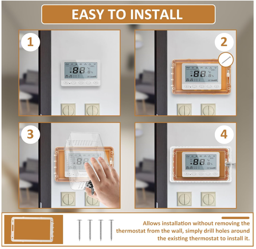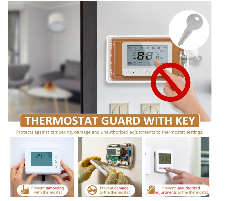A Thermostat Guard is a protective enclosure designed to safeguard thermostats against tampering, accidental damage, or unauthorized adjustments. Built with durable, transparent materials, it ensures the thermostat remains functional and visible while maintaining its set temperature controls. Perfect for both residential and commercial applications, it promotes energy efficiency and prolongs the lifespan of your thermostat.